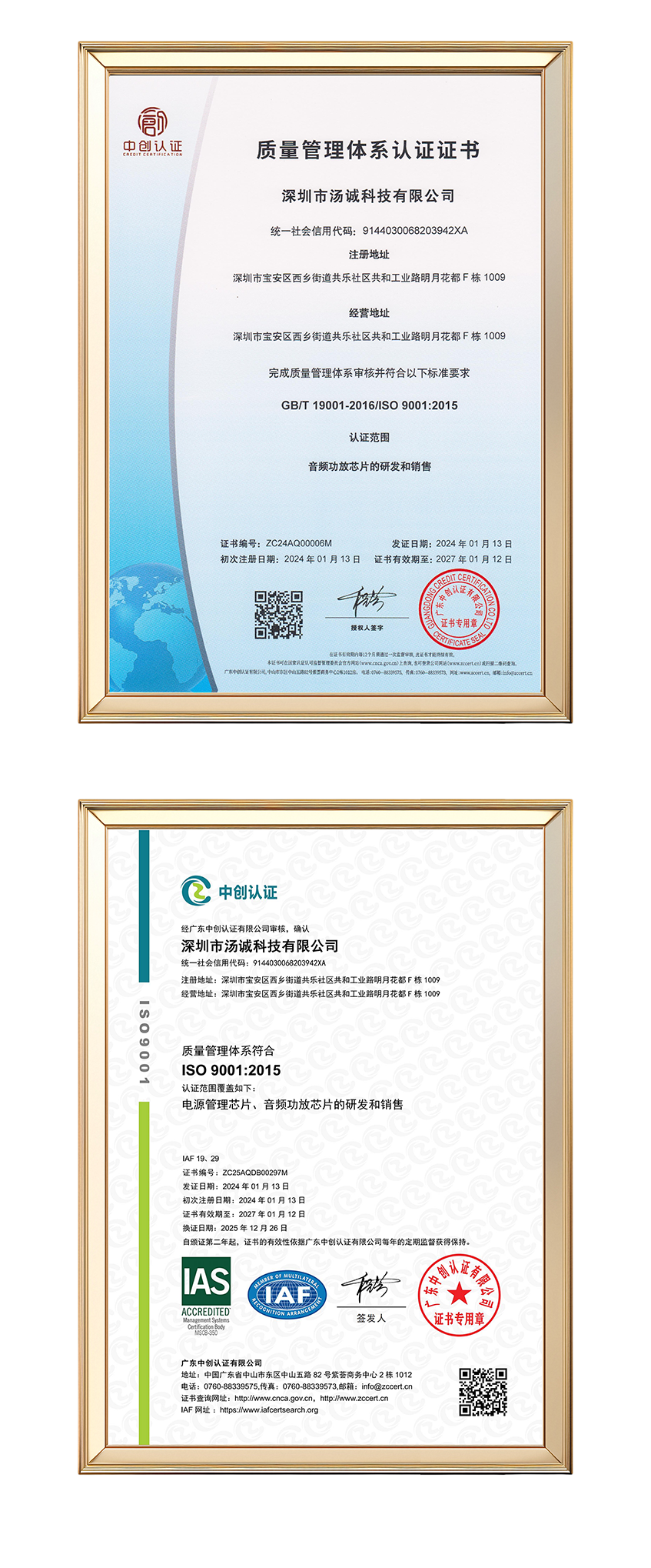 在电源管理芯片、音频功放芯片的研发与销售领域,已通过ISO 9001:2015质量管理体系认证